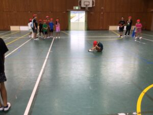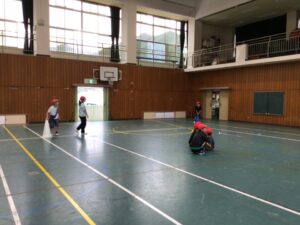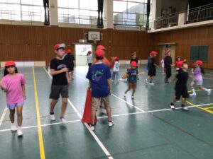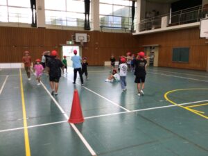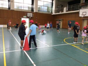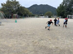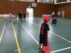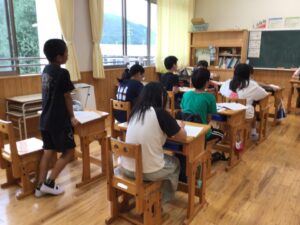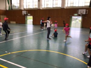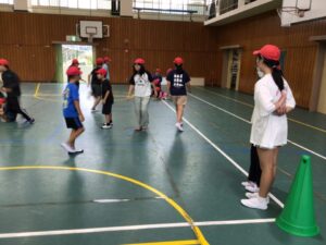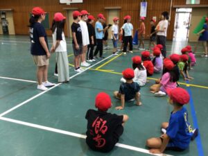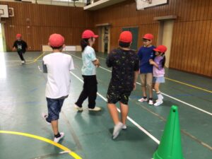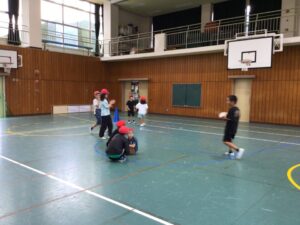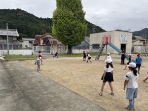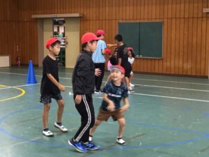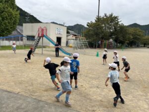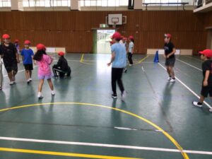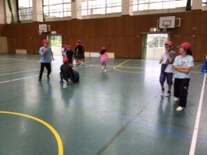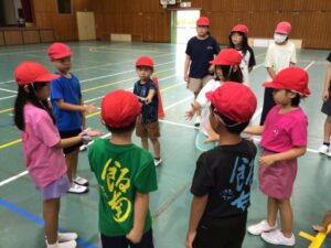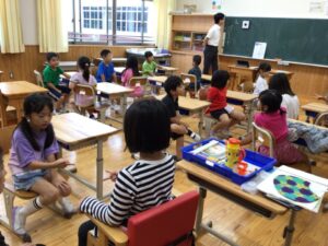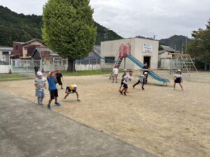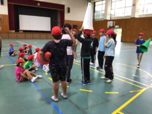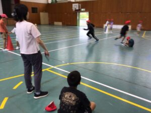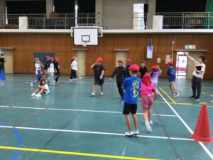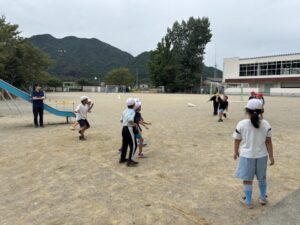 5限目、5年生が1年生と遊んでくれています。四つ角というゲームです。