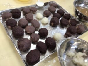丸めたもち米を甲子軒さんのおいしいあんこで包んでいきます。こしあんをもち米で包みきなこをまぶすバージョンも!