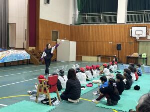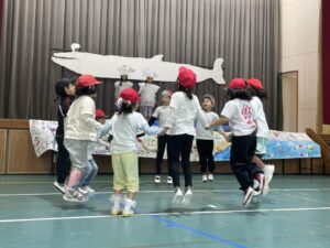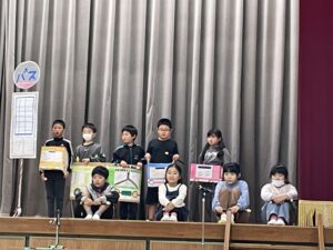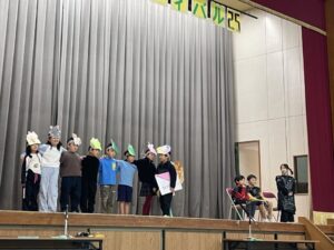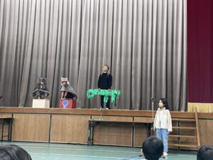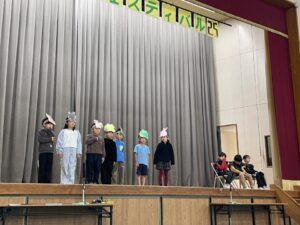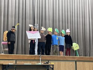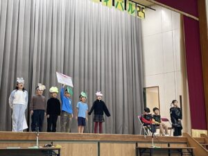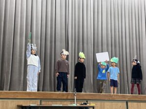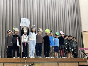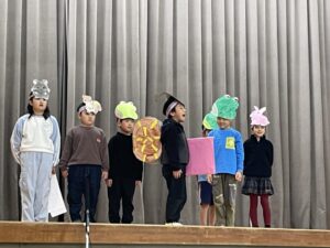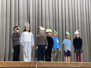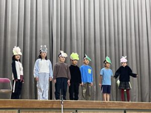 国語で勉強した「お手紙」を小さな動物たちになって演じてくれました。頭につけた絵はみんなでつくりました。みんな大きな声でセリフを言えましたね。すごいです。