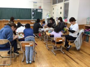 ほんわかライトをつくっています。好きな絵をシートにかいて筒状にしていきます。