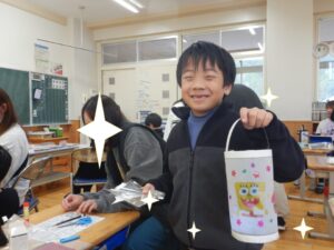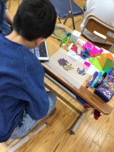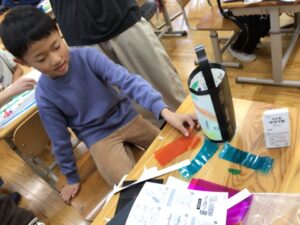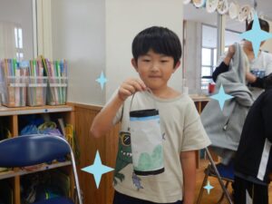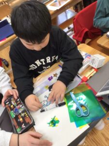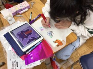 ほんわかライトをつくっています。好きな絵をシートにかいて筒状にしていきます。