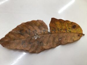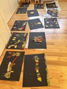 すると、授業でも1年生が落ち葉を探しにやってきました。落ち葉アートができる?
