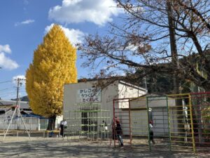 秋の景色ですね。校庭のイチョウは黄色く色づいて葉を落とし始めました。