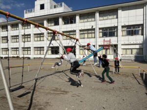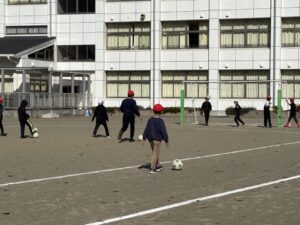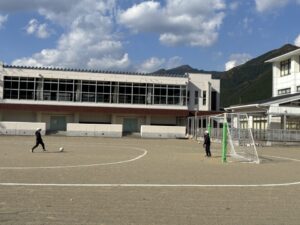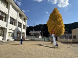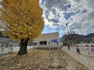 秋の景色ですね。校庭のイチョウは黄色く色づいて葉を落とし始めました。