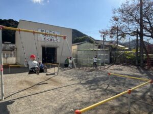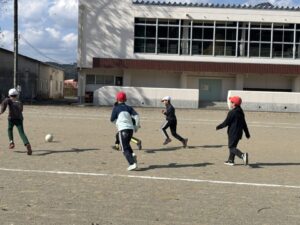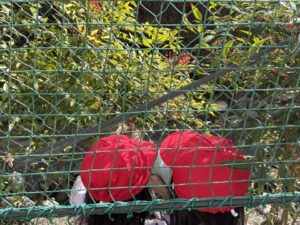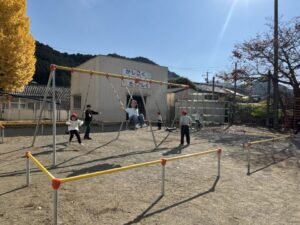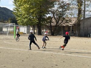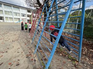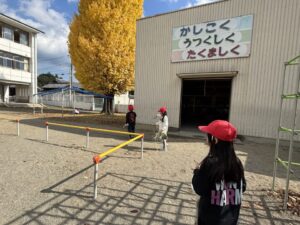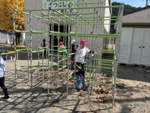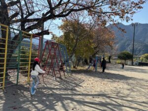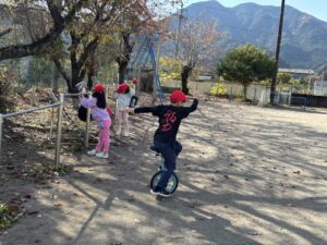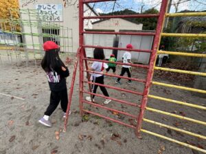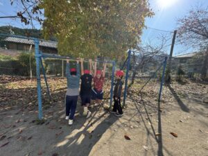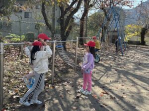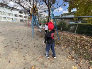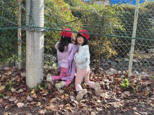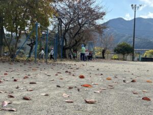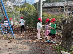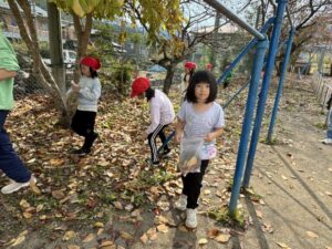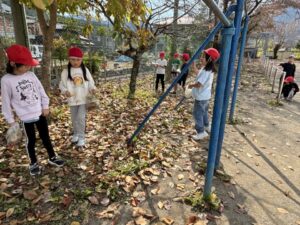 すると、授業でも1年生が落ち葉を探しにやってきました。落ち葉アートができる?