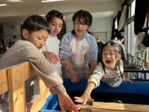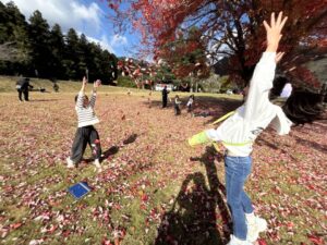 帰り道、ハナノキがとてもきれいだったので、広場で遊んでから帰りました。落ち葉が花びらのようでした。