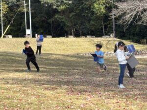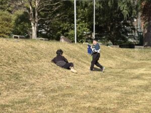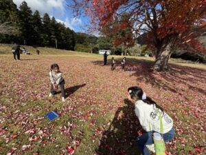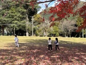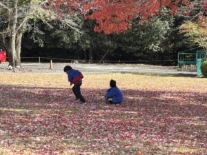 帰り道、ハナノキがとてもきれいだったので、広場で遊んでから帰りました。落ち葉が花びらのようでした。