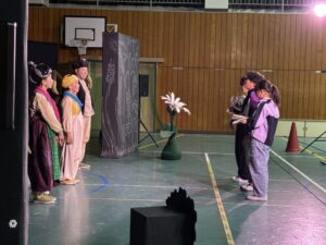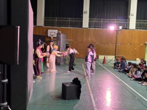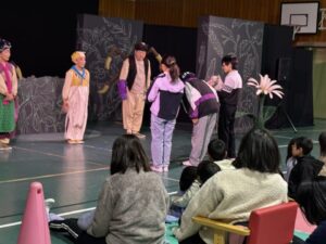 児童会から、劇団のみなさんにお礼の気持ちを込めて、花束と「いきるちからトートバック」を贈りました。