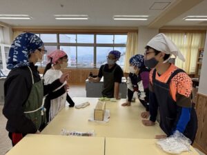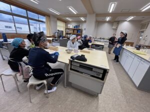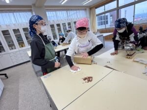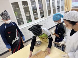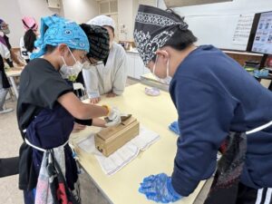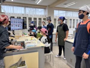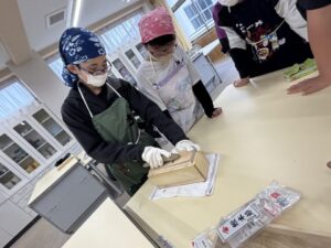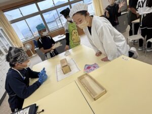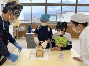先生の指導で、出汁のない味噌汁に鰹節を入れて比べる実験です。鰹節ってすごいですね。