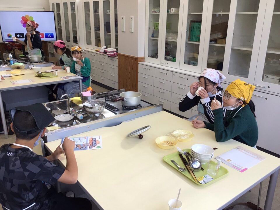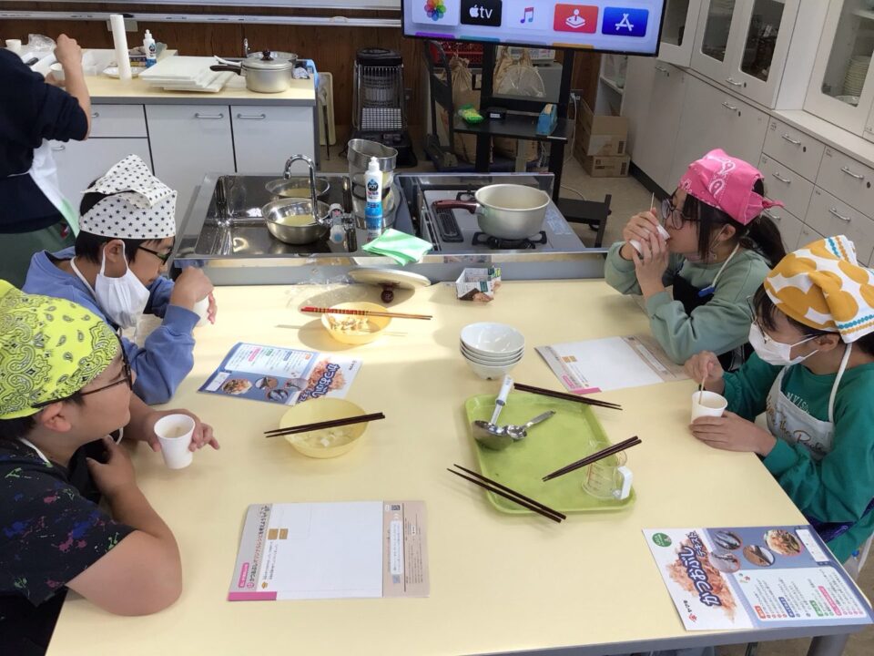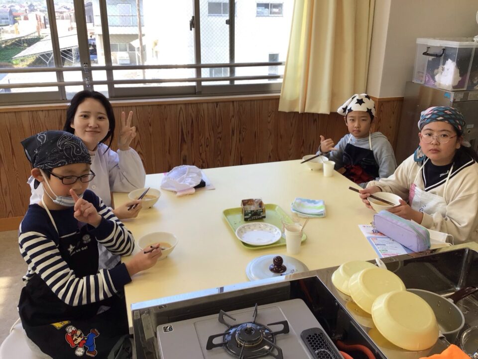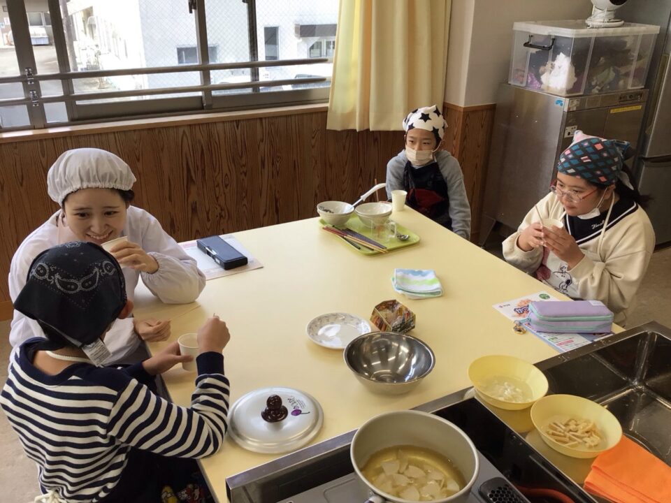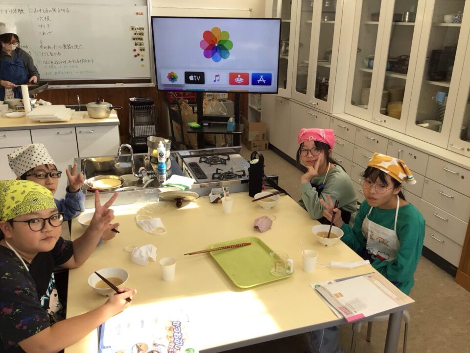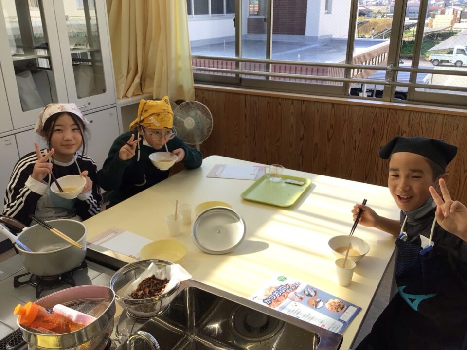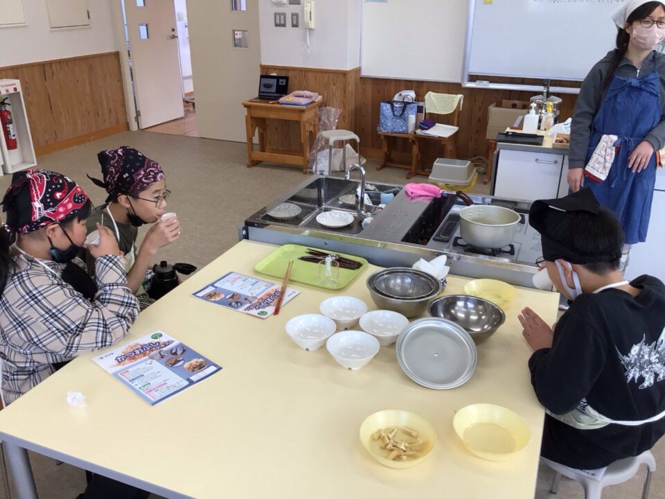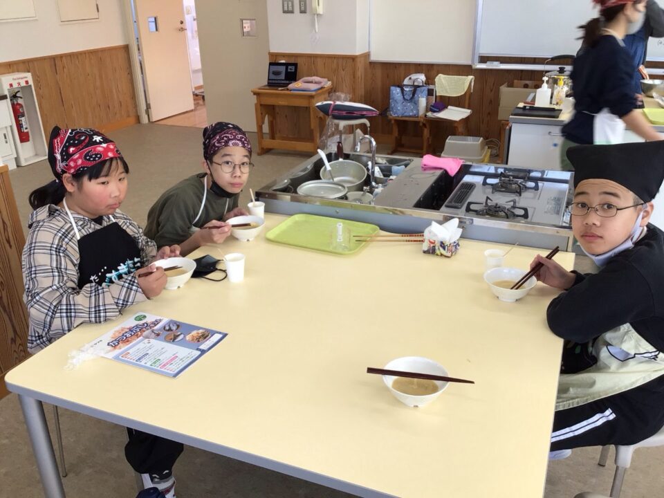 みそ汁が完成し、みんなで試食しました。だしのよくきいたみそ汁は格別で、みんな笑顔で完食していました。