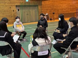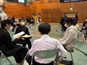 その後の分散会では、中学生や柿野小学校の5,6年生と意見交流をしました。