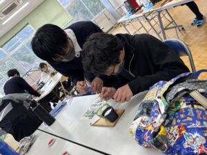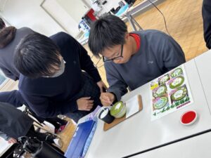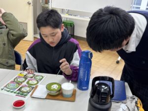 みんなラテアートは未経験です。美術部のみなさんがていねいに教えてくれます。