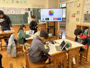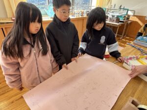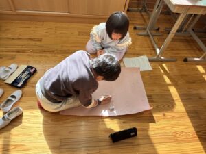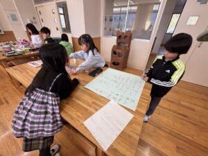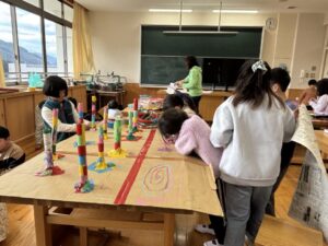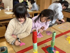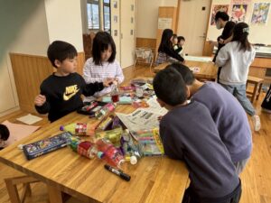 図工室では、1・2年生が合同でおもちゃづくりをしています。とても上手につくられている上に、すてきな色や絵でかわいらしくなっています。