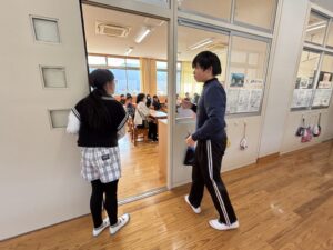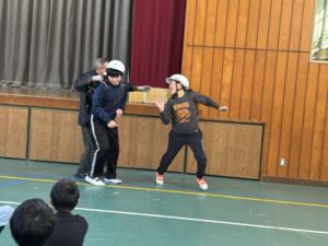 6年生の教室に不審者が侵入しました。子どもたちは、隣の5年生の先生に静かに助けを求めます。