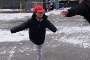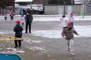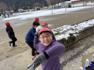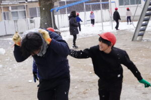 みんな、いい笑顔で雪遊びです。ねらわれているのは先生?