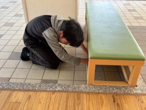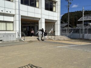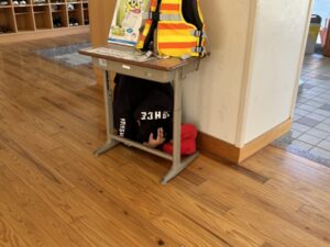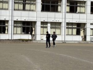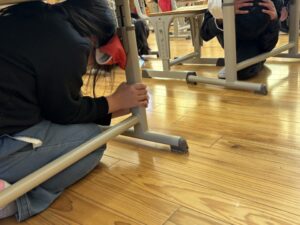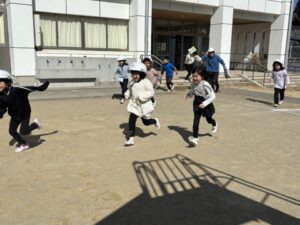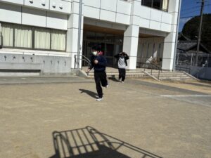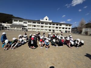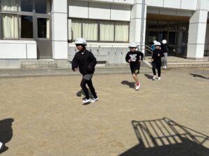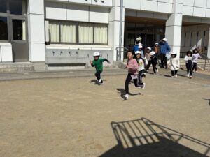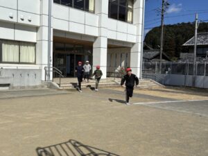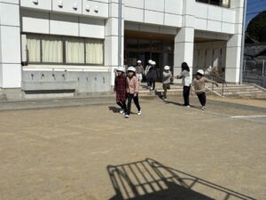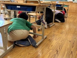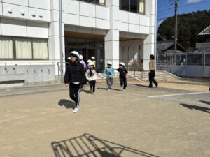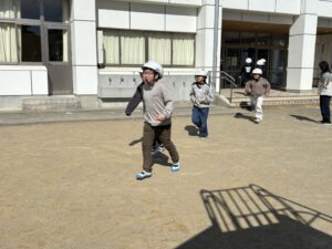 教頭先生から、地震による避難訓練の放送が入りました。予告なしの訓練です。自分たちでベストな行動を考えます。
