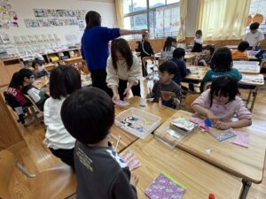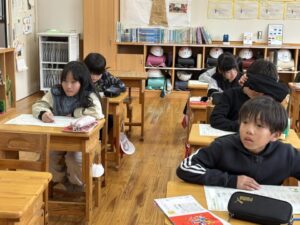 3階では、4年生が漢字テストの答え合わせ中です。基準になる得点を超えられたかな?