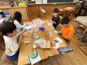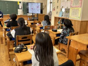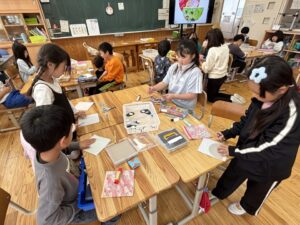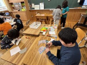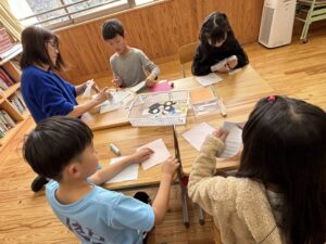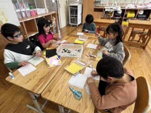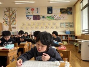 3階では、4年生が漢字テストの答え合わせ中です。基準になる得点を超えられたかな?