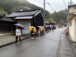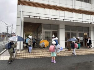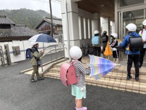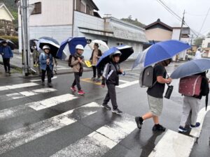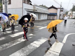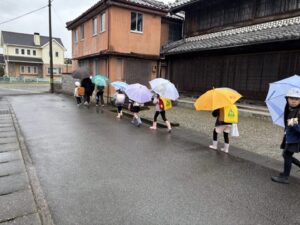 雨の日の登校は大変です。1年生が5人いる団もあります。