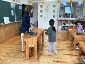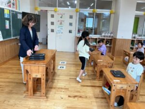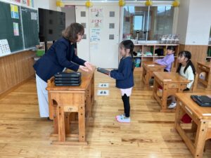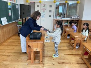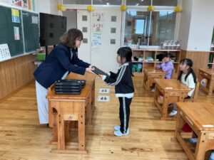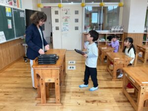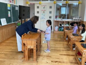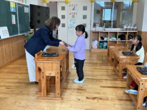 今日から1年生もタブレット端末を使います。1人ずつ手渡しました。